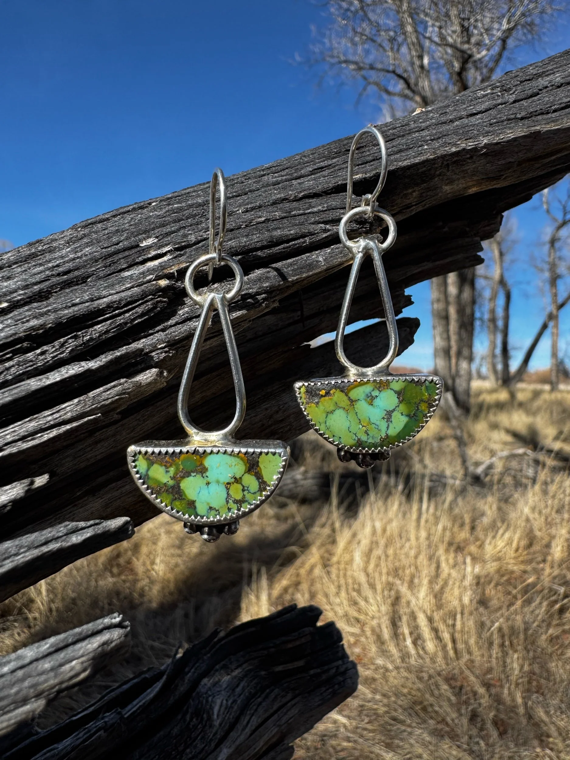 The perfect pair of earrings that go with everything! Mine 8 Turquoise in Sterling Silver. Earrings measure 2 1/4” long from the top of the ear hook. Stamped Sterling and with my maker’s mark.