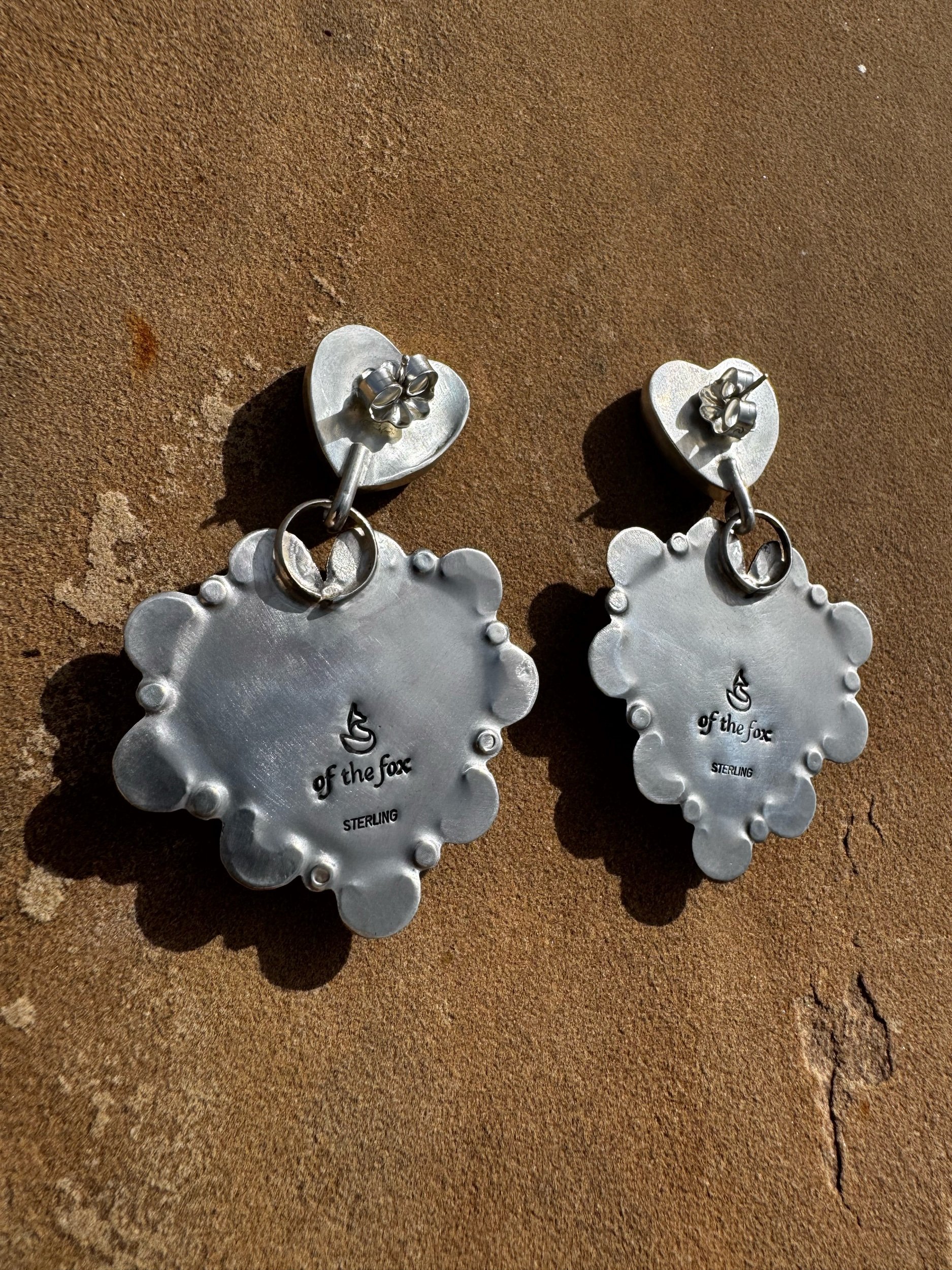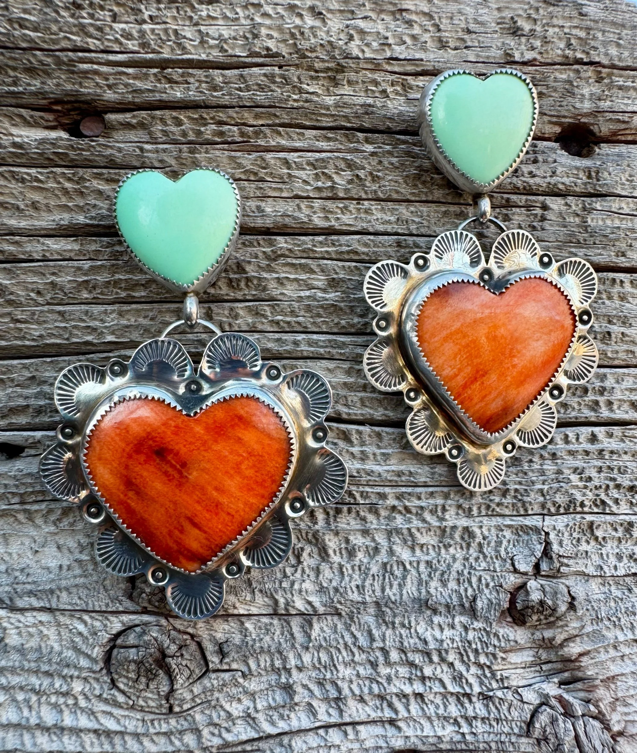 One-of-a-kind double heart statement earrings. Hubei Turquoise and natural orange Spiny Oyster. Measure 2 7/8” long. Stamped Sterling and with my maker’s mark.