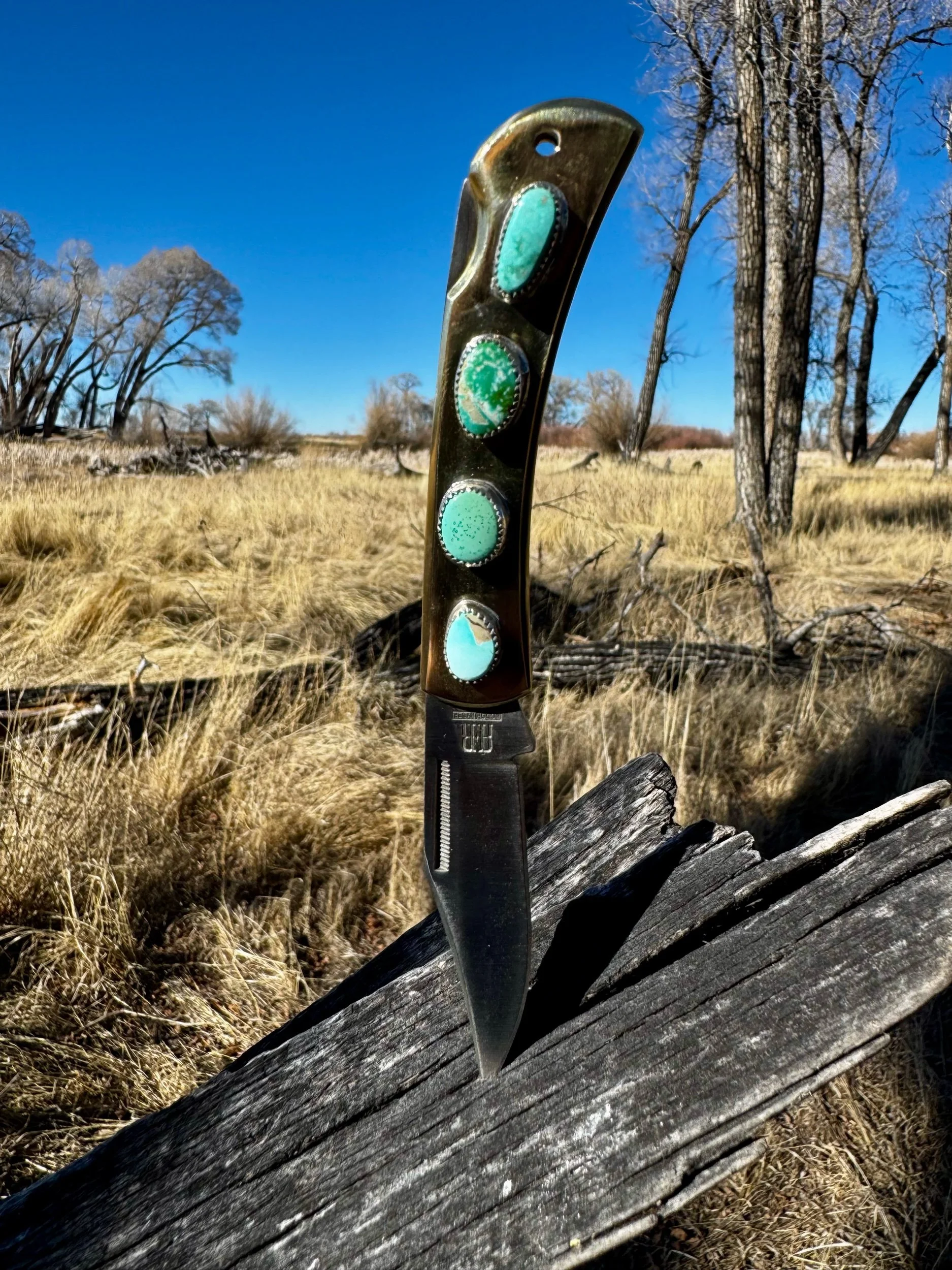 Brass handled knife, steel blade. Royston Turquoise and Fine Silver bezels. Knife measures 3 1/4” folded and has a locking 2 1/2” blade.