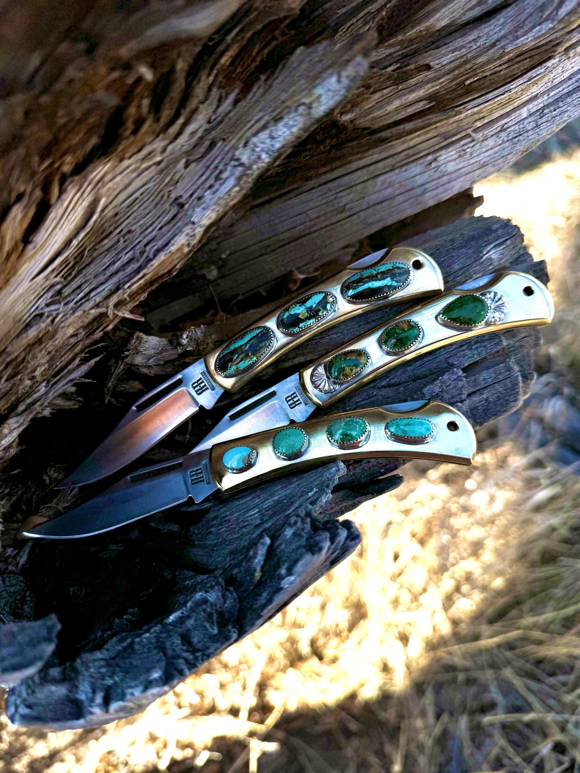 Brass handled knife, steel blade. Blackjack Turquoise and Fine Silver bezels. Knife measures 3 1/4” folded and has a locking 2 1/2” blade.