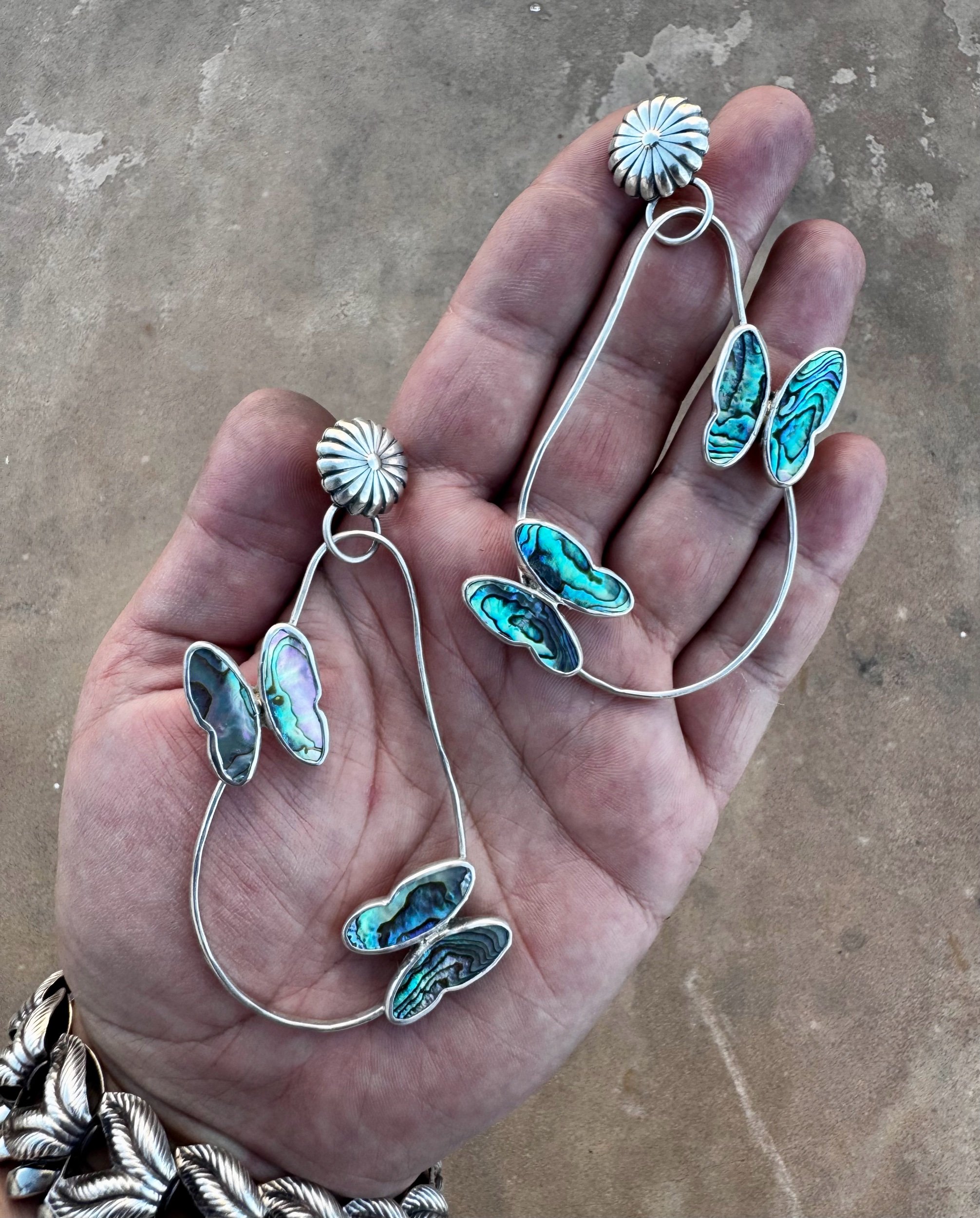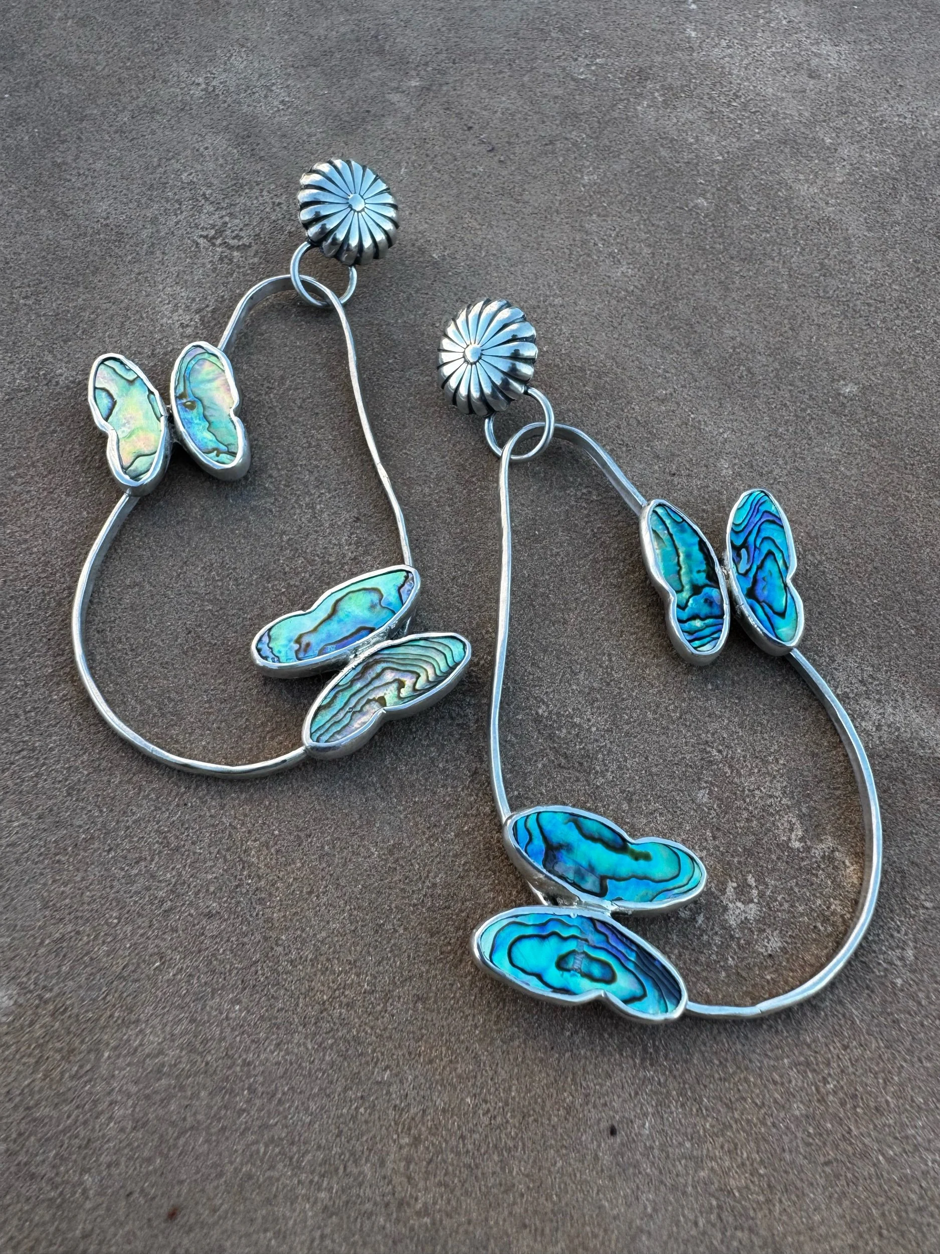 Abalone shell butterflies in Sterling Silver. Post back. Stamped Sterling and with my maker’s mark. Earrings measure 3 3/4” long. Each earring weighs 16.3 grams.